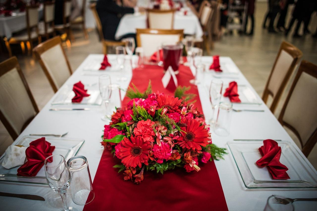 - ¿Qué tipo de arreglos florales o centros de mesa se recomiendan para crear un ambiente elegante y sofisticado en una boda en jardín con una temática de colores rojo y dorado?