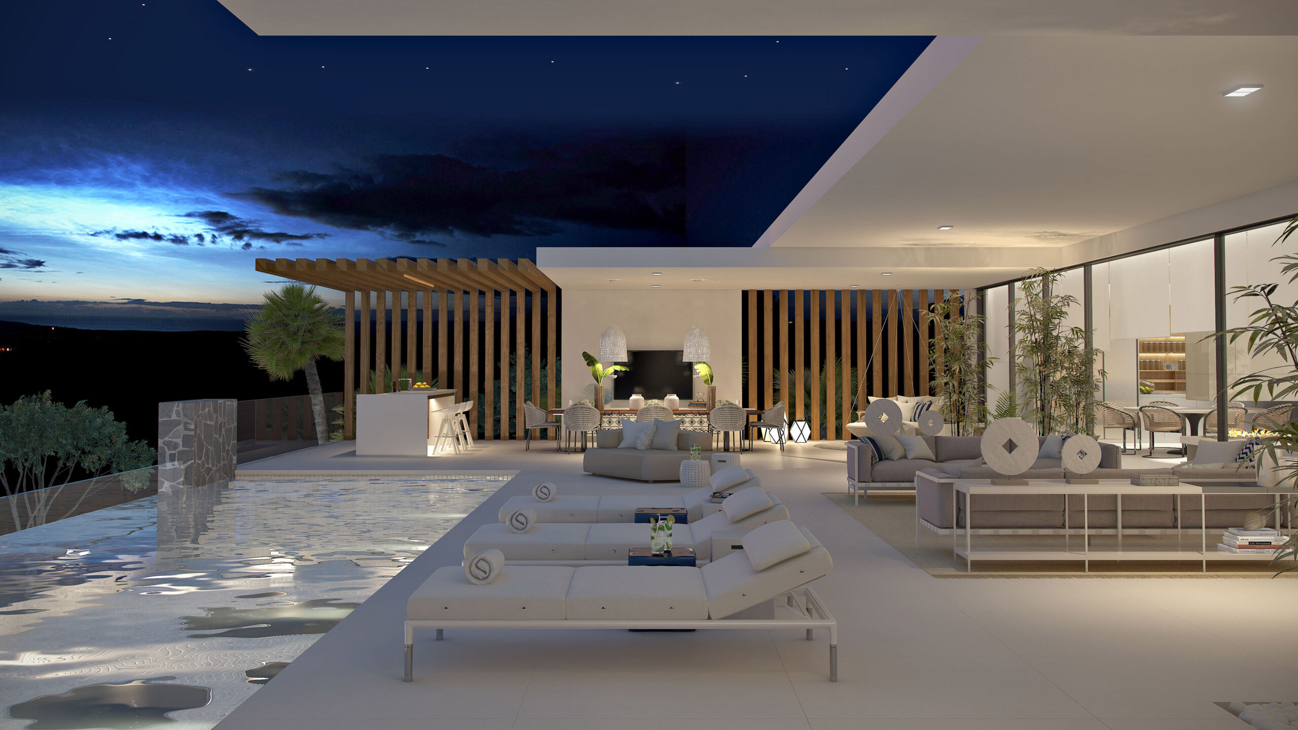 2. Iluminación ambiental: Crea un ambiente cálido y acogedor utilizando luces suaves y difusas, como las guirnaldas de luces o las lámparas colgantes. Estas luces son ideales para crear zonas de descanso o áreas de reunión al aire libre.