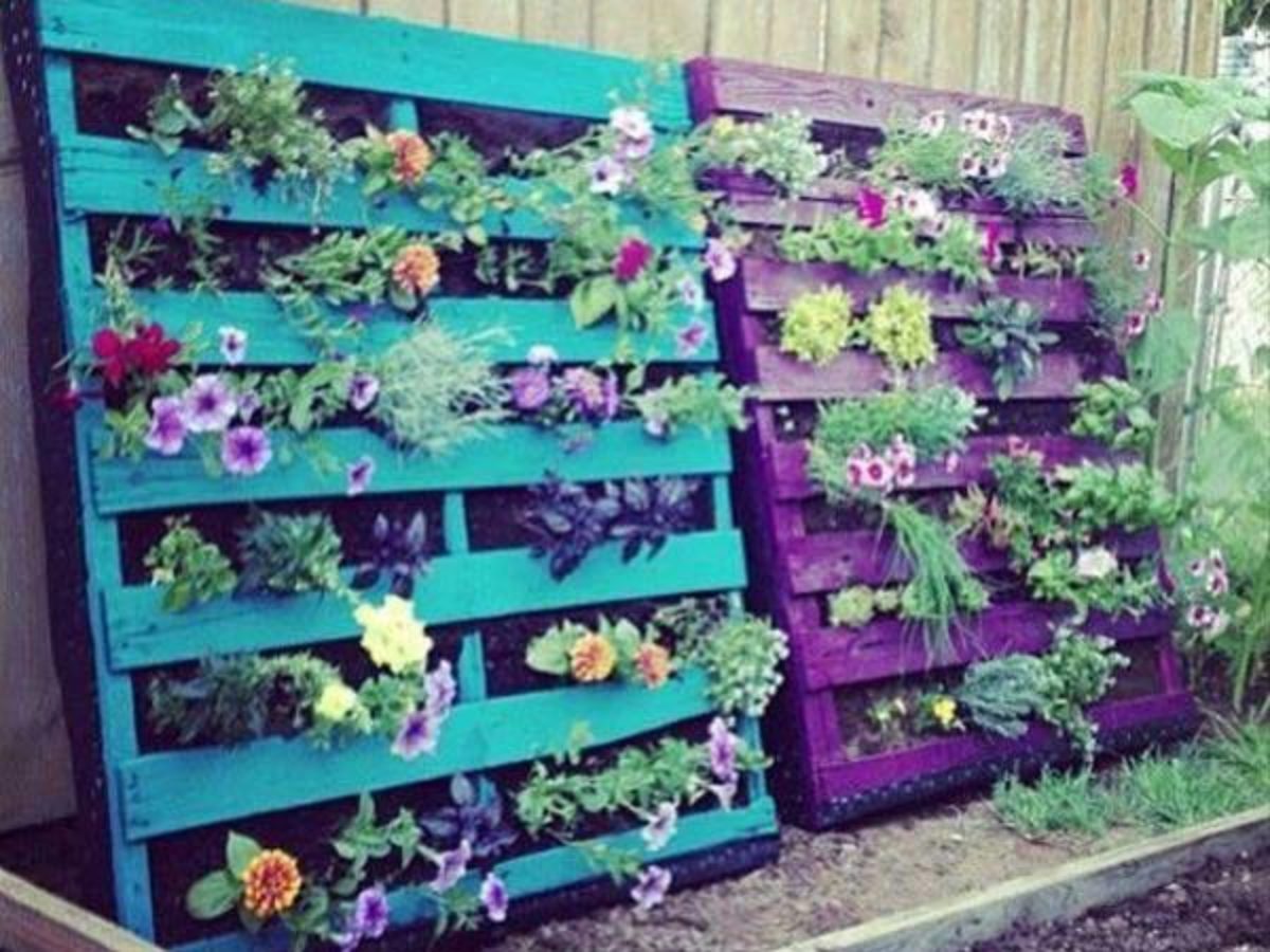 5. Pared de tarimas: Utiliza las tarimas para crear una pared decorativa en tu jardín. Puedes pintarlas de diferentes colores o colocar plantas trepadoras para darle un toque natural y fresco.