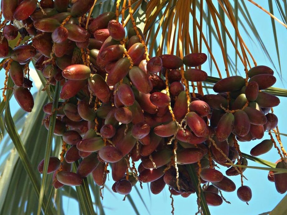 1. Dátiles (Phoenix dactylifera): Los dátiles son conocidos por ser uno de los frutos más populares de las palmeras. Son dulces y se pueden comer frescos o secos. Además, se utilizan en la cocina para hacer postres, mermeladas y pasteles.